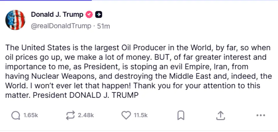 "ABD, açık ara farkla dünyanın en büyük petrol üreticisidir; bu nedenle petrol fiyatları yükseldiğinde çok para kazanıyoruz. Ancak Başkan olarak benim için çok daha büyük ilgi ve öneme sahip olan şey, kötü bir imparatorluk olan İran'ın nükleer silahlara sahip olmasını ve Orta Doğu'yu, hatta dünyayı yerle bir etmesini durdurmaktır."