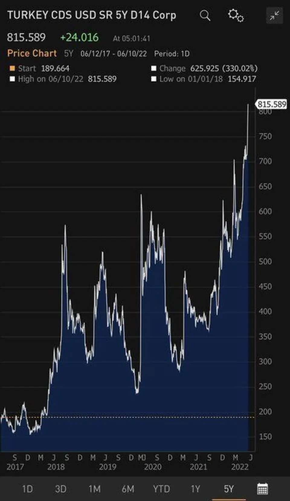 Son 14 yılın en yüksek seviyesine bugün itibariyle 815.589 seviyesini gördü. Kuru baskılamak için yoğun döviz satışı yapıldığı görülmekte. Bu sebepten ötürü CDS'de yukarı yönlü bir ivme gözüküyor. Bundan önce en son 2008 krizinde 831 seviyelerini çok kısa görmüştü. Faiz inadı sebebiyle hem CDS hem Dolar hemde enflasyon maalesef ki gün geçtikçe rekora biniyor.