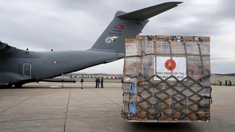 Sağlık Bakanlığınca hazırlanan malzemeler, Etimesgut Askeri Havaalanı'nda Türk Silahlı Kuvvetlerine (TSK) ait A 400M tipi dev nakliye uçağına yüklendi.
