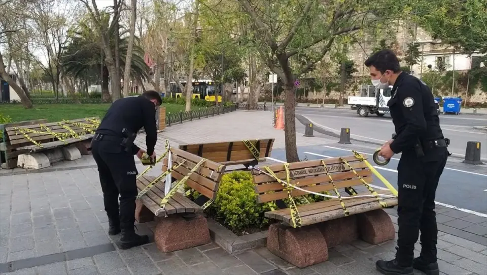 Bu vatandaşlara sosyal mesafeyi korumaları ve eve gitmeleri yönünde uyarıda bulunan polis ekipleri, vatandaşların dağılmaları üzerine banklara şerit çekti.