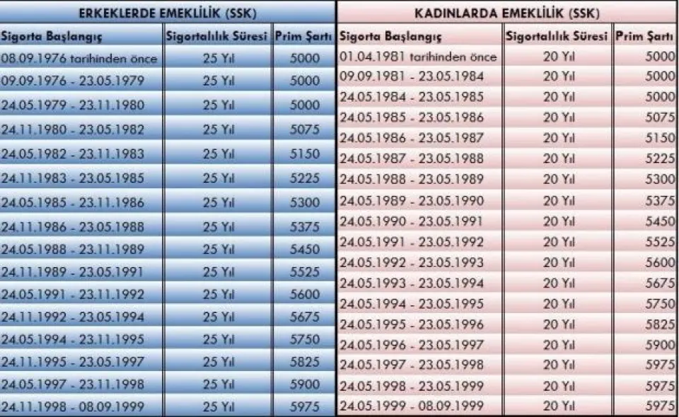Erkekler için: 9000 prim günü (eşitleme çalışmaları ile 7200 gün olması da gündemde)