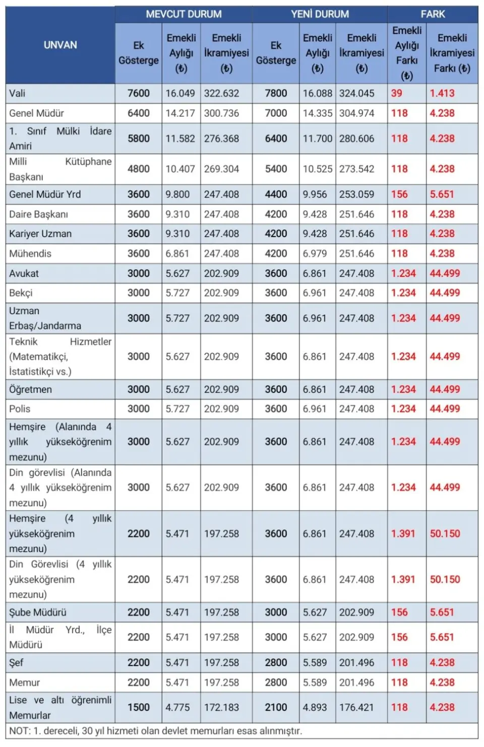 Bakanlık, birinci derece ve 30 yıl hizmeti olan devlet memurlarını esas alarak ek gösterge artışının bazı unvanların emekli aylık ve ikramiyelerine etkisine ilişkin tablo da hazırladı.