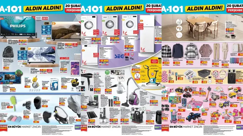 A101'in 20 Şubat Perşembe gününe özel aktüel kataloğu yayımlandı. Elektronikten mutfak eşyalarına, mobilyadan gıdaya kadar şok indirimler tüm A101 mağazalarında sizleri bekliyor.