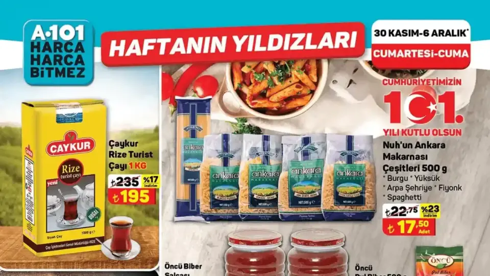 30 Kasım’dan itibaren A101 marketlerde satışa sunulacak olan ürünler, fiyatlarıyla adeta şaşırtıyor. Çaydan makarnaya, çikolatalı kekten pul biber çeşitlerine kadar her kategoride devrim niteliğinde indirimler! Bu fırsatlar kaçmaz!
