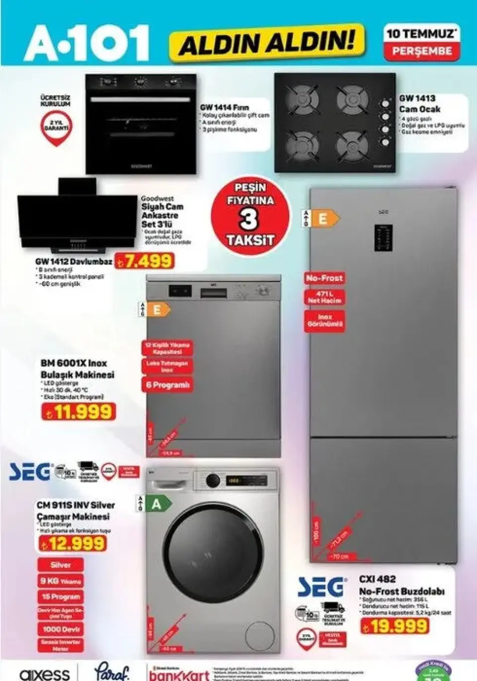 Evini yenilemek isteyenler için A101, beyaz eşya kategorisinde cazip fırsatlar sunuyor. No-frost buzdolabı 19.999 TL, inox bulaşık makinesi 11.999 TL ve çamaşır makinesi 12.999 TL’den alıcı bekliyor. Soğutucu net hacmi 356 litre, dondurucu net hacmi 115 litre olan derin dondurucu ise 5,2 kg/24 saat dondurma kapasitesiyle mutfakların vazgeçilmezi olmaya aday. Teknoloji meraklıları içinse taşınabilir portatif klima 26.999 TL ve siyah cam ankastre 3’lü set 7.499 TL’den satışta.