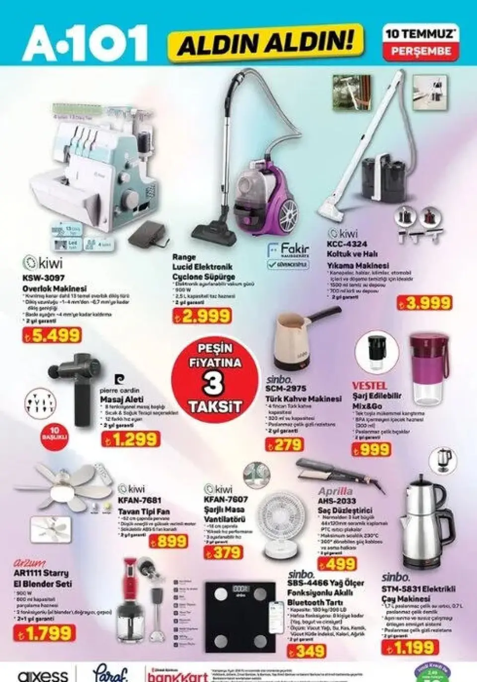 A101’in 11 Temmuz kataloğu, mutfak ve ev gereçlerinde de dopdolu. El blender seti (el blender’ı, doğrayıcı, çırpıcı) 1.799 TL, elektrikli çay makinesi 1.199 TL ve şarj edilebilir Mix&Go 999 TL’den sunuluyor. Ayrıca, koltuk ve halı yıkama makinesi 3.999 TL ve overlok makinesi 5.499 TL ile evde profesyonel çözümler arayanlara hitap ediyor.