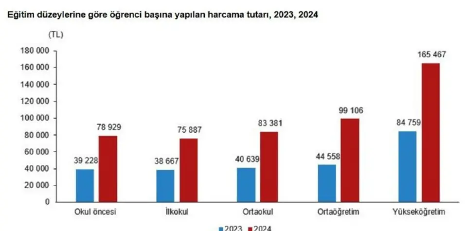 - Yükseköğretimde öğrenci başına harcama 165 bin 467 TL ile zirveyi korudu