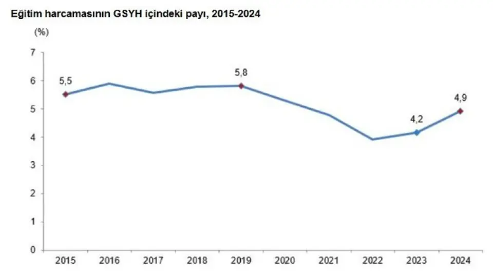 Harcanan devasa rakime rağmen eğitim, milli gelirden yeterince pay alamıyor. Eğitim harcamalarının GSYH içindeki oranı 2023’teki yüzde 4,2’den 2024’te yüzde 4,9’a yükselse de, OECD ortalaması olan yüzde 6’nın oldukça gerisinde kaldı.