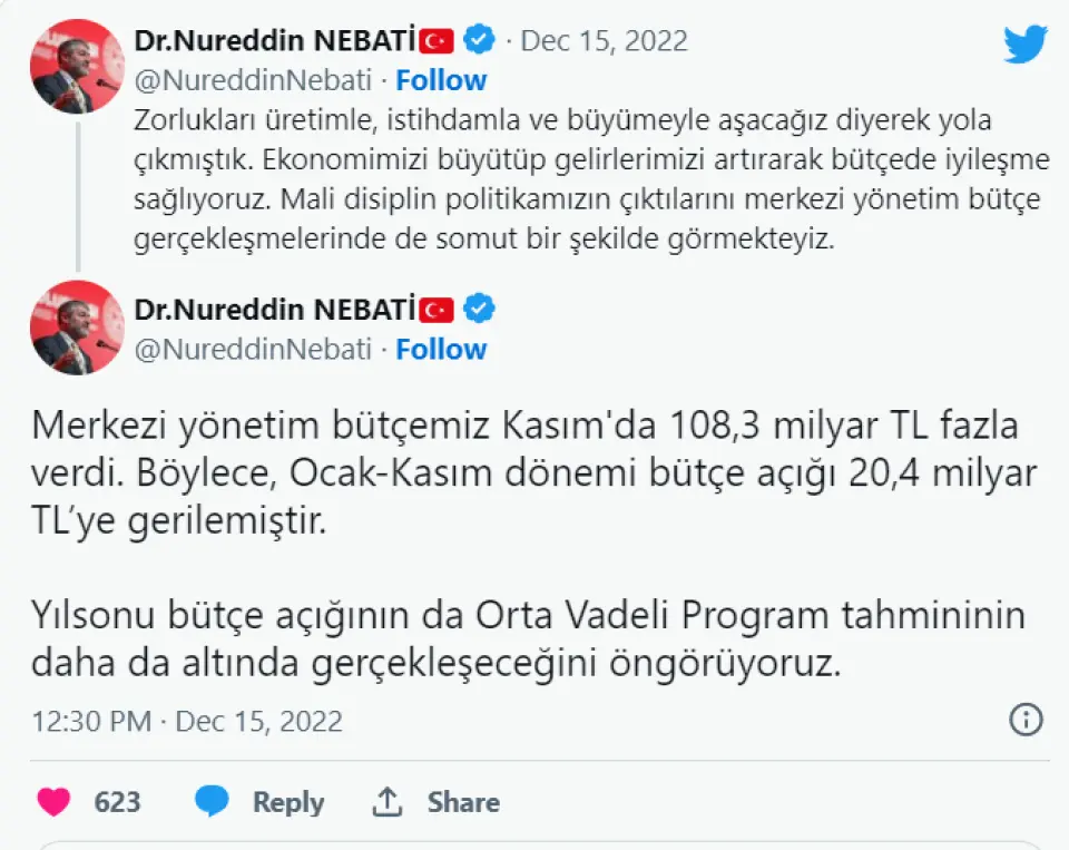 Nebati, sosyal medya hesabından, kasım ayına ilişkin merkezi yönetim bütçe gerçekleşme sonuçlarını değerlendirdi.