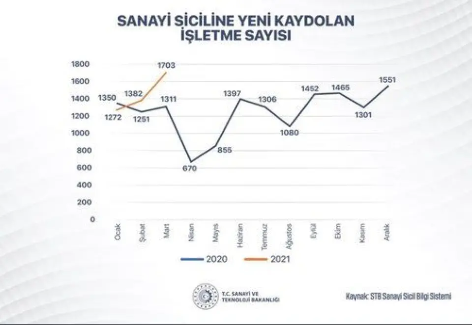 Sanayi ve Teknoloji Bakanı Mustafa Varank, sosyal medyadan yaptığı açıklamada, "İmalat sanayine verdiğimiz destek ve teşvikler karşılık buluyor. Mart ayında sanayi sicil bilgi sistemine yeni kaydolan işletme sayısı geçen yılın aynı ayına göre yüzde 30 artışla 1703 oldu. Ekonomimizin rotasını yatırım, istihdam, üretim ve ihracatta tutmakta kararlıyız" ifadelerini kullandı.
