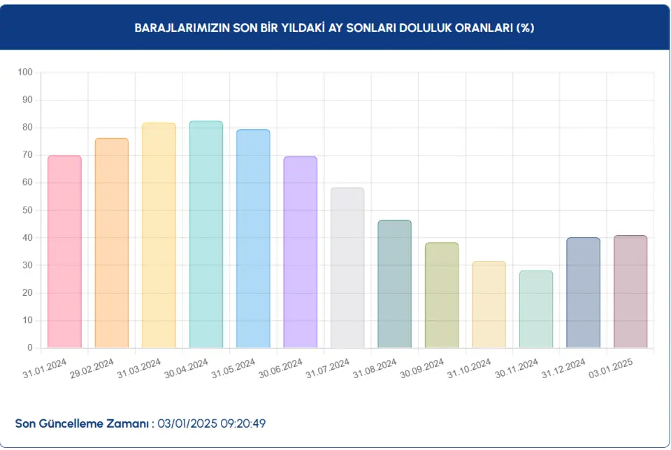 İSKİ tarafından 03.01.2025 tarihinde saat 09.20'de paylaşılan verilere göre İSKİ ortalama baraj doluluk oranı - %41.02
