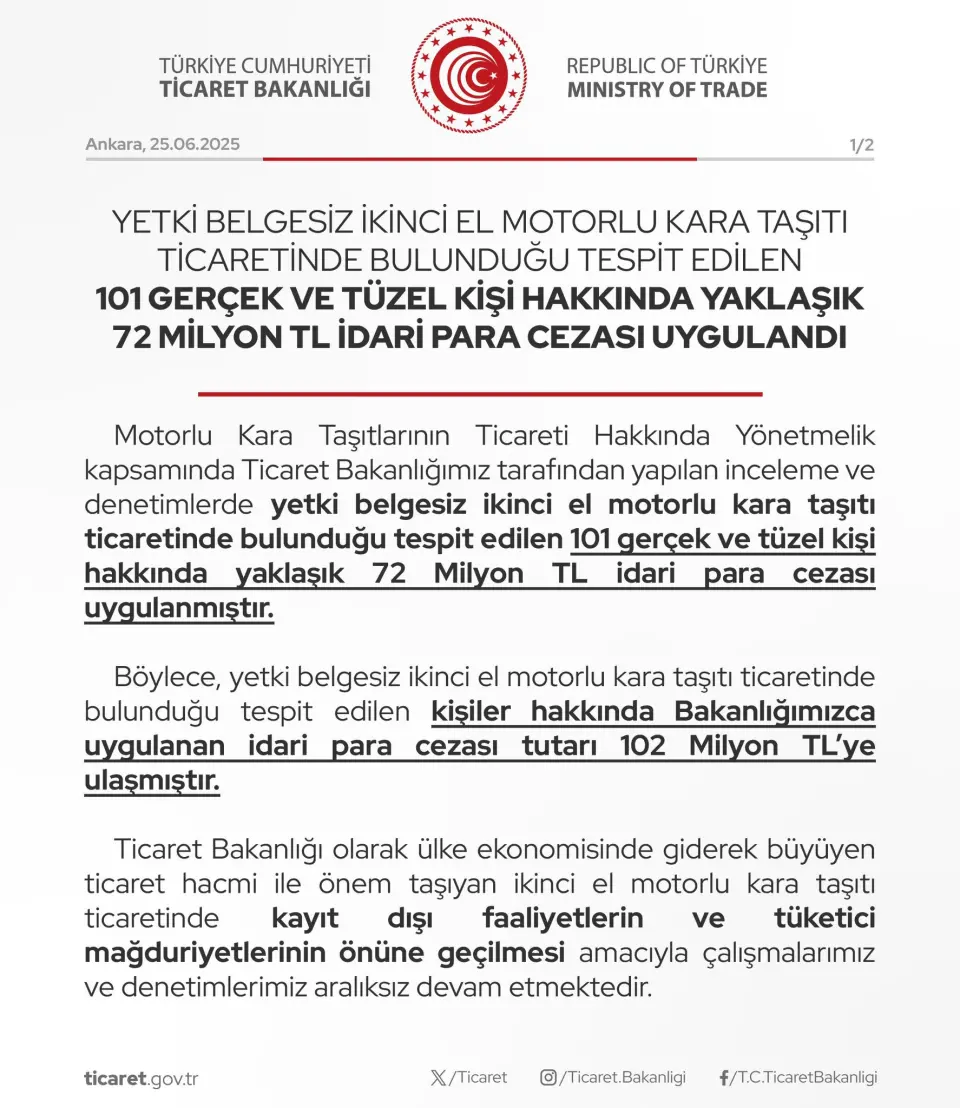 Ticaret Bakanlığı, ikinci el araç ticaretinde yetki belgesi olmadan faaliyet gösterenlere yönelik denetimlerini sıkılaştırdı. 101 kişi ve kuruluşa 72 milyon TL ceza kesilirken, toplam ceza miktarı 102 milyon TL’ye ulaştı.
