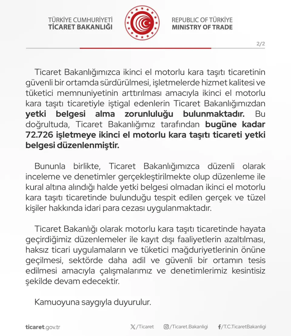Bakanlık, yaptığı açıklamada, ikinci el araç ticaretinde kayıt dışılığı bitirmek ve tüketicilerin haklarını korumak için kararlı bir mücadele yürütüldüğünü belirtti. “Motorlu Kara Taşıtlarının Ticareti Hakkında Yönetmelik” çerçevesinde gerçekleştirilen denetimlerde, yetki belgesi zorunluluğuna uymayanlara karşı yaptırımların devam edeceği vurgulandı.