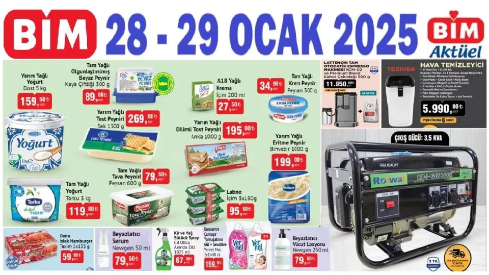 BİM, 28-29 Ocak 2025 tarihlerinde geçerli olacak Aktüel Ürünler Broşürü ile şimdiye kadar sunulan en cazip indirimleri alışveriş tutkunlarına getiriyor. Gıdadan temizlik malzemelerine, kişisel bakımdan beyaz eşyaya kadar geniş ürün yelpazesi ile her ihtiyacı karşılayan fırsatlarla dolu bu kampanyayı kaçırmayın!