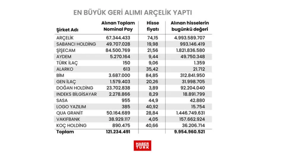 Yabancı yatırımcıların Borsa İstanbul'dan çıkış süreciyle birlikte hisse fiyatları düşen dev şirketler ucuz buldukları kendi hisselerini geri alma yoluna gitti. Öyle ki son 1 yılda bugünkü değeri yaklaşık 10 milyar lirayı bulan hisse geri alımları olduğu görüldü. Bu geri alımlar bir yandan hisse senedi piyasasına da can suyu olurken diğer yandan şirketler de kimilerinde sermayelerinin yüzde 20'sine kadar olan hisselerini ucuz buldukları fiyattan yerine koyarak farklı bir yatırım anlayışını benimsedi.
