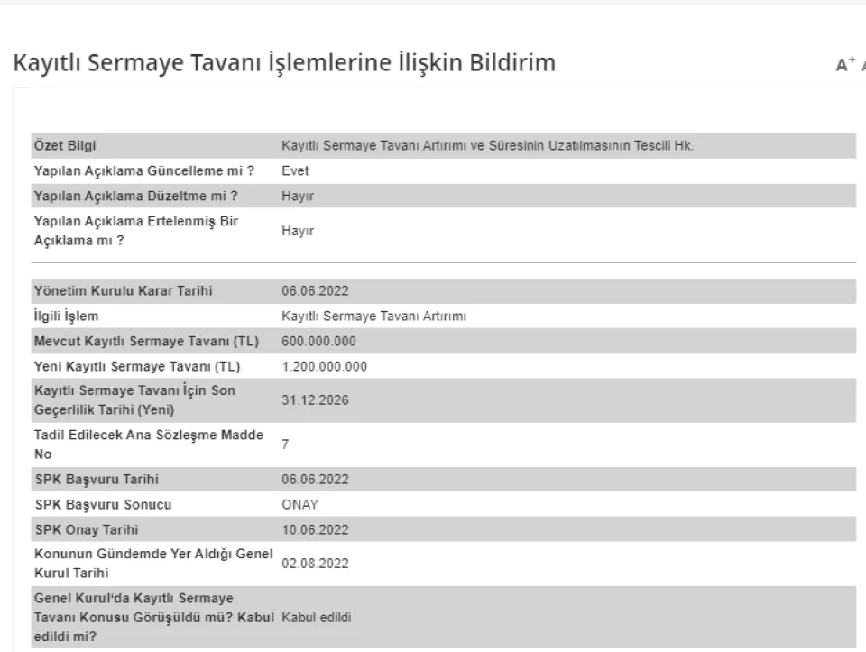 Şirketimizin kayıtlı sermaye tavan tutarının 2022-2026 yılları arasında geçerli olacak şekilde 600.000.000 TL (AltıyüzmilyonTürkLirası)'dan 1.200.000.000 TL (BirmilyarikiyüzmilyonTürkLirası)'na yükseltilmesi,04.08.2022 tarih ve 10632 sayılı Türkiye Ticaret Sicil Gazetesinde ilan edilmiştir.
