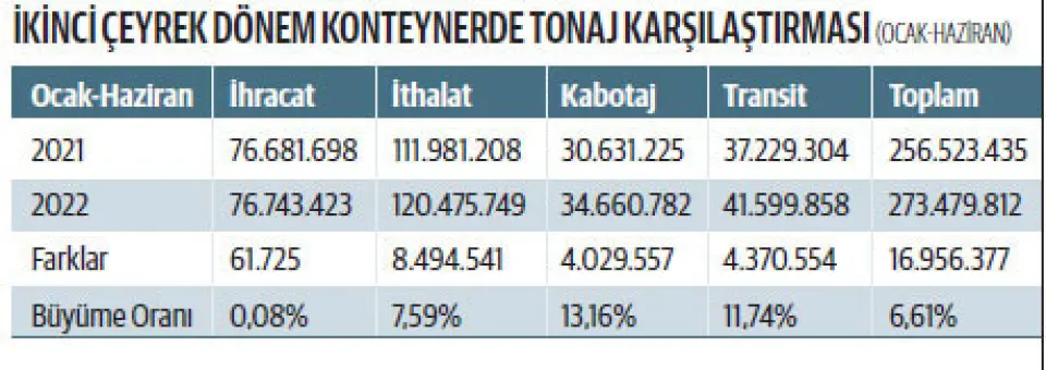 Türkiye’nin ticarete açılan kapıları limanlar, 2022’nin ikinci çeyreğinde 2021’in aynı dönemine göre toplam yükte yüzde 6,6 oranında artış ve 16,9 milyon tonluk tonaj farkıyla toplamda 273 milyon ton yük elleçlendi.