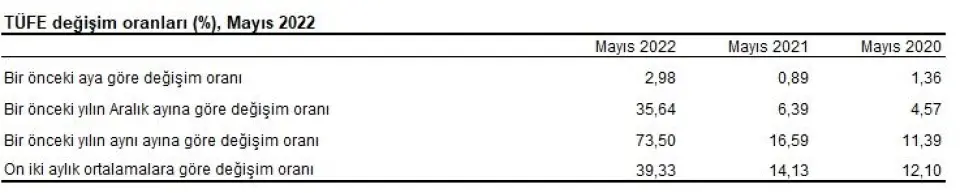 TÜFE'de (2003=100) 2022 yılı Mayıs ayında bir önceki aya göre %2,98, bir önceki yılın Aralık ayına göre %35,64, bir önceki yılın aynı ayına göre %73,50 ve on iki aylık ortalamalara göre %39,33 artış gerçekleşti.