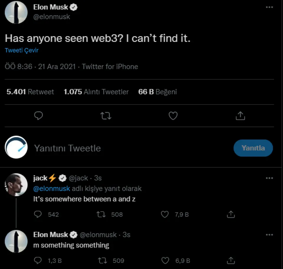 Musk, yine Web 3 eleştirisiyle Twitter sahnesine çıktı. “Web 3’ü gören var mı? Ben bulamıyorum” yazan Musk’a, geçtiğimiz günlerde Twitter CEO’luğundan ayrılan ve Square şirketinin de adını Block olarak değiştiren Jack Dorsey de yanıt verdi.
