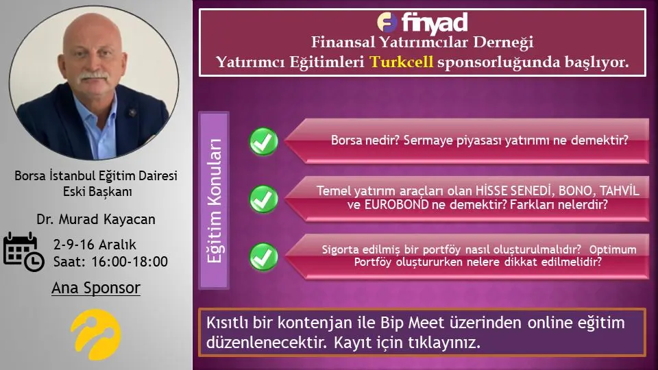 Finansal Yatırımcılar Derneğinin, Borsa İstanbul Eğitim Dairesi Eski Başkanı Dr. Murat Kayacan’ın eğitmenliğindeki Yatırımcı Eğitimleri, Turkcell’in ana sponsorluğunda başlıyor.