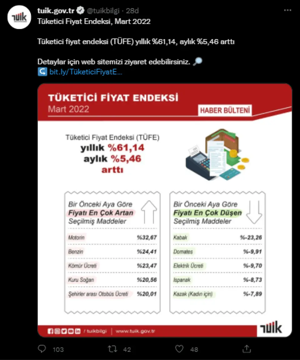 Tüketici Fiyat Endeksi, Mart 2022 Tüketici fiyat endeksi (TÜFE) yıllık %61,14, aylık %5,46 arttı.