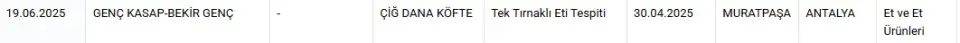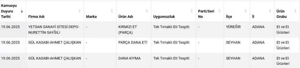 Adana’da yapılan denetimlerde, Yüreğir ilçesindeki Yetsan Sanayi Sitesi Depo’da (Nurettin Sayğılı) kırmızı parça ette tek tırnaklı hayvan eti bulundu. Aynı şekilde, Seyhan ilçesinde faaliyet gösteren Gül Kasabı (Ahmet Çalışkan) adlı işletmenin parça dana eti ve dana kıymasında da benzer bir ihlal tespit edildi. Antalya’da ise Muratpaşa ilçesindeki Genç Kasap (Bekir Genç) firmasının çiğ dana köftesinde tek tırnaklı hayvan eti kullanıldığı belirlendi. Bakanlık, bu işletmelerin ürünlerini “sağlığı tehlikeye düşüren gıdalar” listesine aldı.