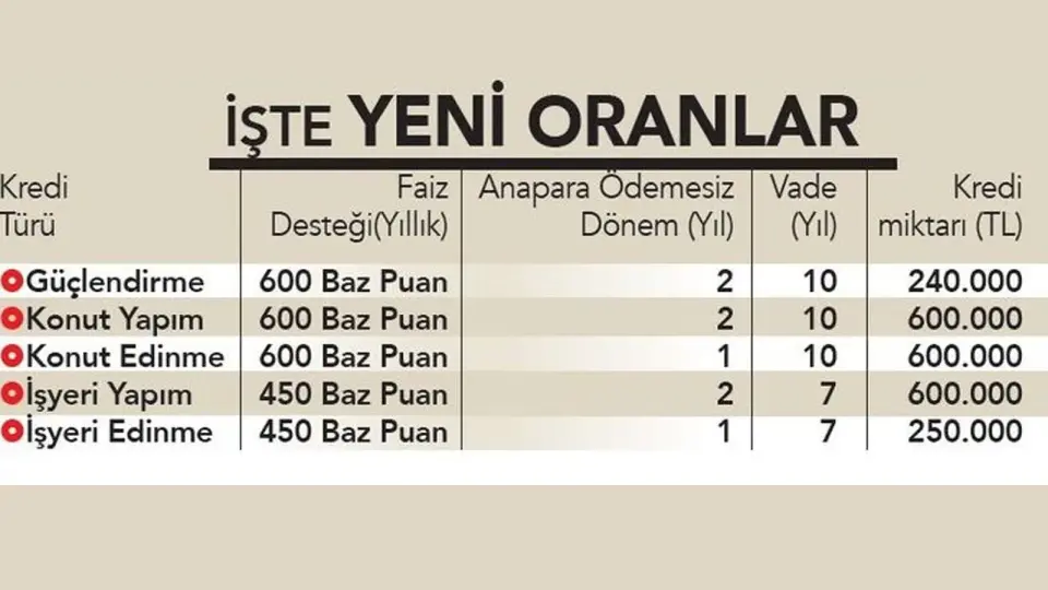 Güçlendirme ve konut yapım ve edinme kredilerinde faiz oranı 400 baz puandan 600'e, işyeri yapım ve edinme kredileri ise 300 baz puandan 450 puana yükseltildi.