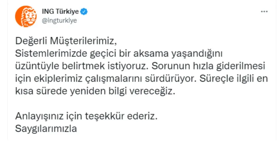 “Değerli Müşterilerimiz, Sistemlerimizde geçici bir aksama yaşandığını üzüntüyle belirtmek istiyoruz. Sorunun hızla giderilmesi için ekiplerimiz çalışmalarını sürdürüyor. Süreçle ilgili en kısa sürede yeniden bilgi vereceğiz. Anlayışınız için teşekkür ederiz. Saygılarımızla.”