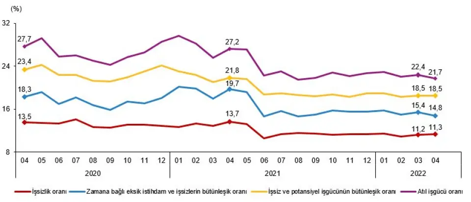 Zamana bağlı eksik istihdam, potansiyel işgücü ve işsizlerden oluşan atıl işgücü oranı 2022 yılı Nisan ayında bir önceki aya göre 0,7 puan azalarak %21,7 oldu. Zamana bağlı eksik istihdam ve işsizlerin bütünleşik oranı %14,8 iken potansiyel işgücü ve işsizlerin bütünleşik oranı %18,5 olarak tahmin edildi.