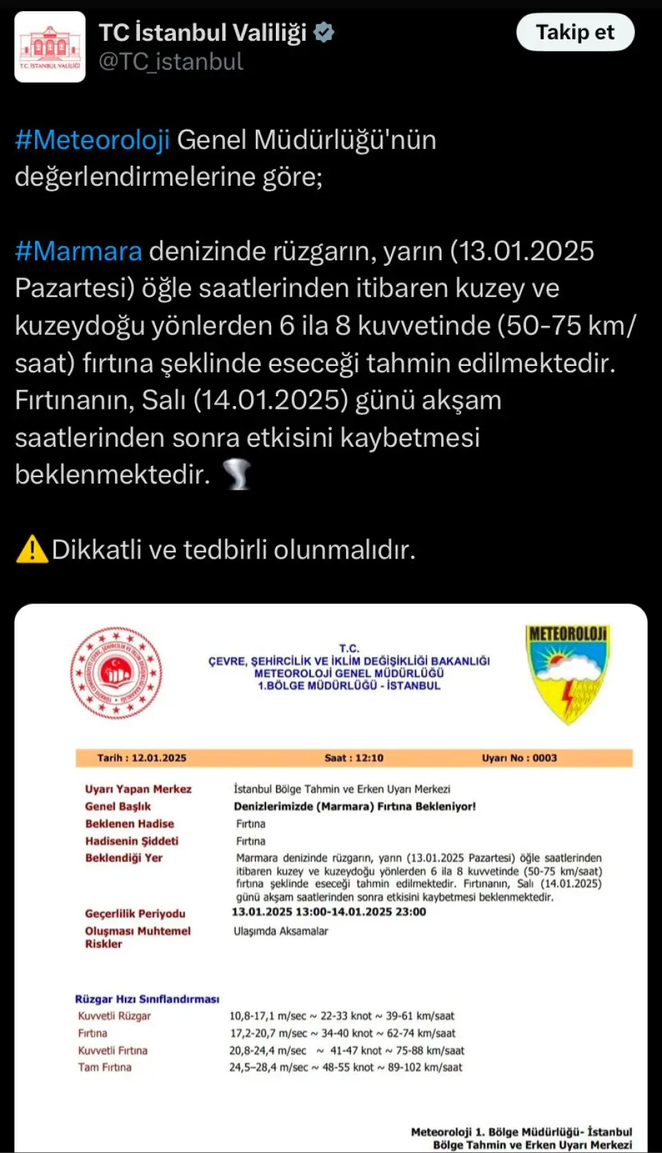 Yetkililer, fırtına sırasında deniz trafiğinin yanı sıra sahil bölgelerinde bulunanların da dikkatli olması gerektiğini vurguladı. İstanbul Valiliği’nin açıklaması, resmi internet sitesi ve sosyal medya hesapları üzerinden vatandaşlarla paylaşıldı.