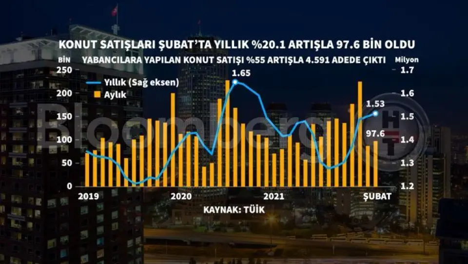 Türkiye'de konut satışları Şubat ayında bir önceki yılın aynı dönemine göre yüzde 20,1 arttı.