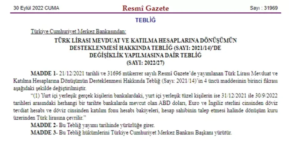 Türkiye Merkez Bankasıdan, Türk Lirası Mevduat Ve Katılma Hesaplarına Dönüşümün Desteklenmesi Hakkında Tebliğ’de değişiklik yapılmasına dair tebliğ Resmi Gazete’de yayımlandı. Buna göre, Şirketler ve tüzel kişiler, 31 Aralık 2021 ile 30 Eylül 2022 tarihleri arasındaki herhangi bir tarihte bankalarda mevcut olan dolar, euro ve sterlin hesaplarını Türk lirasına çevirebilecek. Ayrıca tebliğ, yayımı tarihinde yürürlüğe girer. Tüzel kişilerin kur korumalı mevduat sistemine dahil olmasını sağlayan düzenleme, 31 Aralık 2021 tarihinde bankalarda bulunan döviz hesapları için geçerli olacak şekilde başlamıştı.(milliyet)