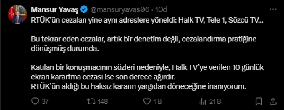 “Halk TV’ye verilen ekran karartma cezası son derece ağırdır. RTÜK’ün aldığı bu haksız kararın yargıdan döneceğine inanıyorum.”