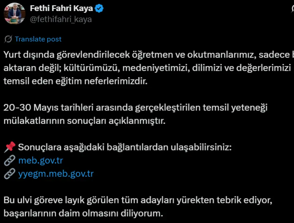 Milli Eğitim Bakanlığı yetkililerinden Fethi Fahri Kaya, sonuçların açıklanmasının ardından yaptığı açıklamada, “Bu görev, bir meslekten çok daha fazlasını ifade ediyor. Seçilen eğitimcilerimiz, ülkemizin ruhunu ve değerlerini sınırlar ötesine taşıyacak. Kendilerini gönülden tebrik ediyor, başarılarının devamını diliyorum” dedi.
