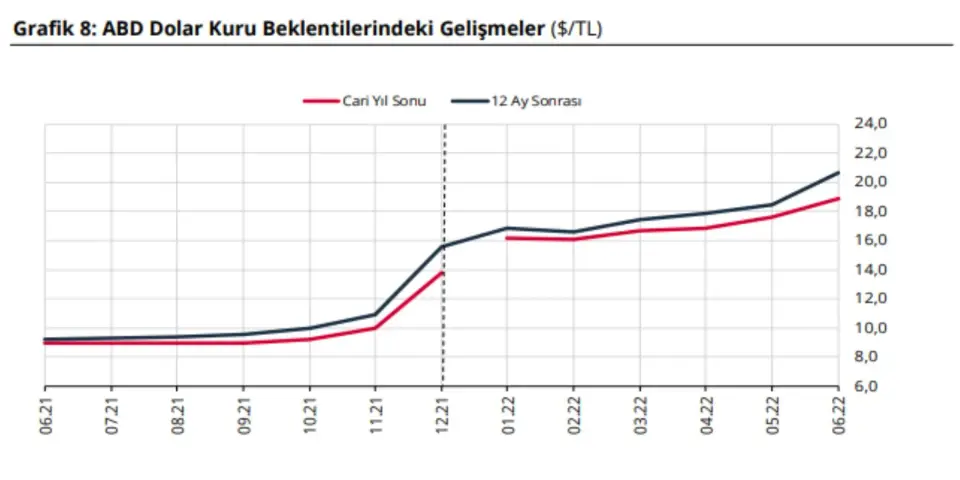 12 ay sonrası döviz kuru beklentisi ise aynı anket dönemlerinde sırasıyla 18,47 TL ve 20,70 TL olarak gerçekleşti.