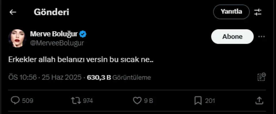 Oyuncu ve sosyal medya fenomeni Merve Boluğur, 25 Haziran 2025’te yaptığı bir paylaşımda sıcak havadan duyduğu rahatsızlığı dile getirirken kullandığı sert ifade nedeniyle sosyal medyada tartışma yarattı. Boluğur’un paylaşımı kısa sürede yüz binlerce görüntülenme aldı.