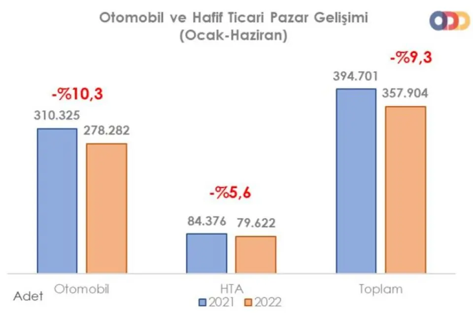 Buna göre, Türkiye otomobil ve hafif ticari araç toplam pazarı, yılın ilk 6 ayında bir önceki yılın aynı dönemine göre yüzde 9.3 oranında azalarak 357 bin 904 adet olarak gerçekleşti.