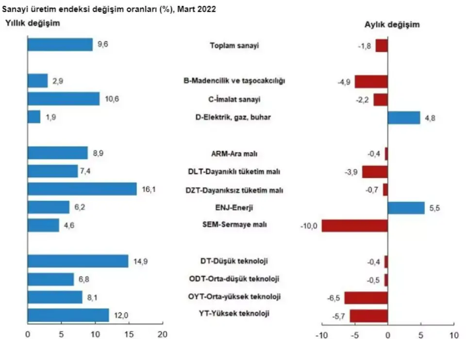 Sanayinin alt sektörleri incelendiğinde, 2022 yılı Mart ayında madencilik ve taş ocakçılığı sektörü endeksi bir önceki aya göre %4,9 ve imalat sanayi sektörü endeksi %2,2 azalırken, elektrik, gaz, buhar ve iklimlendirme üretimi ve dağıtımı sektörü endeksi %4,8 arttı. (bigpara)