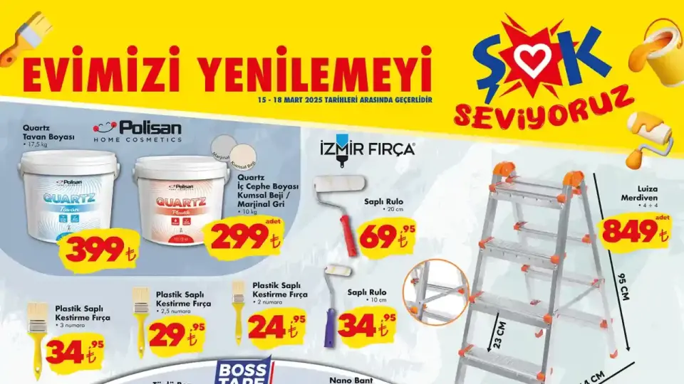 ŞOK, 15-18 Mart 2025 tarihleri arasında geçerli olacak yeni aktüel ürünler kataloğunu duyurdu. Boya malzemelerinden elektrikli aksesuarlara kadar geniş bir yelpazede fırsatlar sunan katalog, evini yenilemek isteyenler için cazip seçenekler içeriyor.