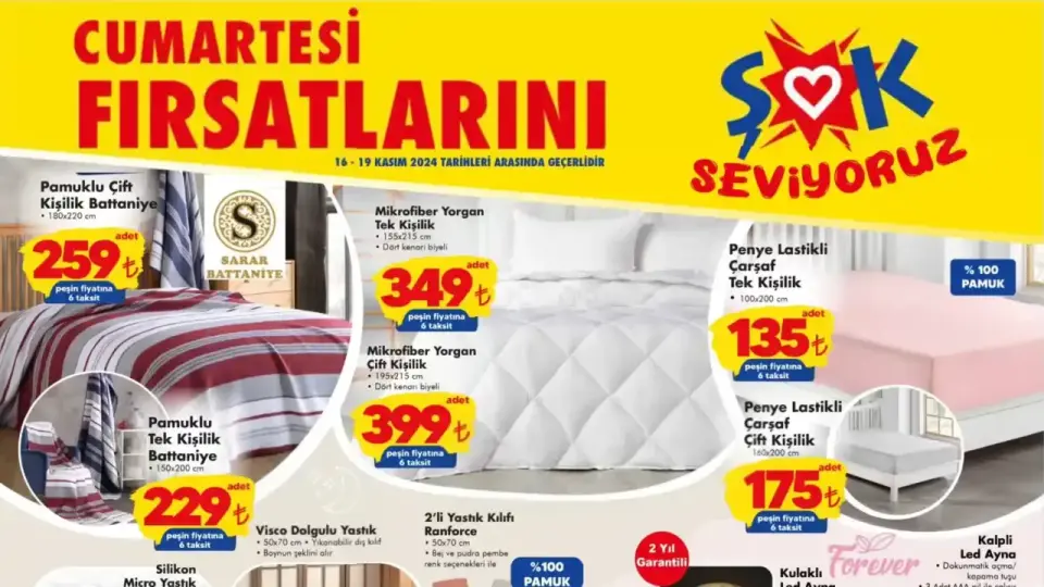 ŞOK market, 16-19 Kasım tarihlerinde baş döndürücü indirimlerle ev tekstilinden teknolojiye, çocuk oyuncaklarından beyaz eşyaya kadar her ihtiyacı karşılıyor. Stoklarla sınırlı bu fırsatları kaçırmayın.