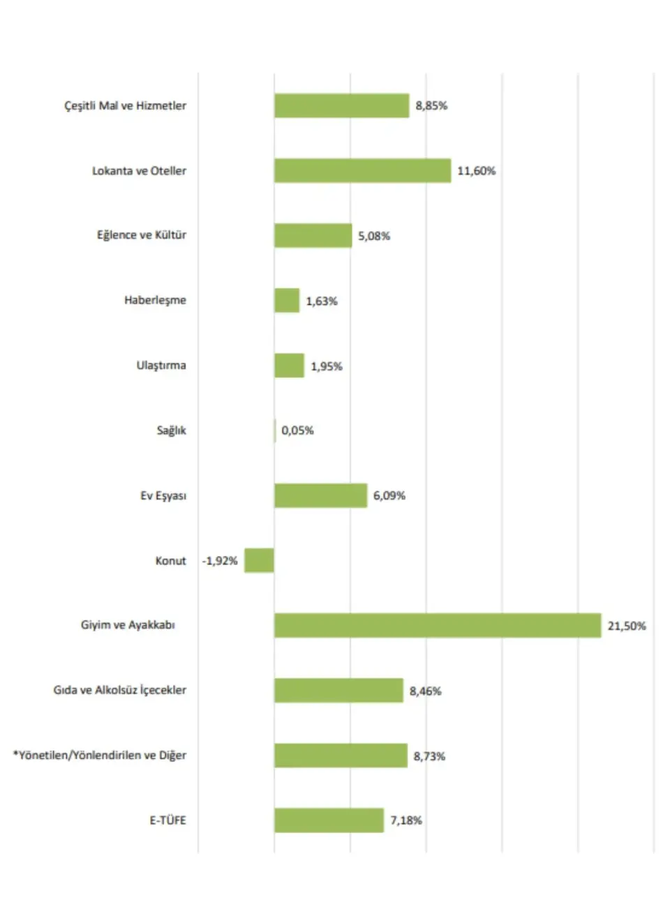 TÜİK alt grupları gösterge olarak alındığında en fazla aylık azalış -yüzde 1.92 ile Konut en fazla yükseliş ise yüzde 21.50 ile giyim ve ayakkabı kaleminde gerçekleşmiştir.(cumhuriyet)