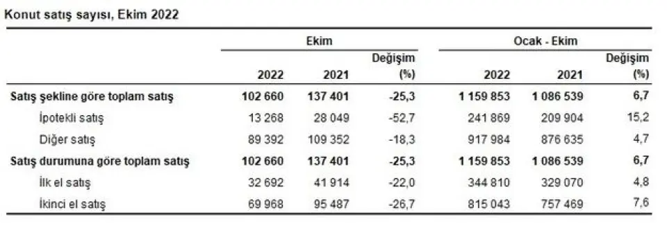 Türkiye genelinde ikinci el konut satışları Ekim ayında bir önceki yılın aynı ayına göre yüzde 26,7 azalış göstererek 69 bin 968 oldu. Toplam konut satışları içinde ikinci el konut satışının payı yüzde 68,2 oldu. İkinci el konut satışları Ocak-Ekim döneminde ise bir önceki yılın aynı dönemine göre yüzde 7,6 artışla 815 bin 43 olarak gerçekleşti.