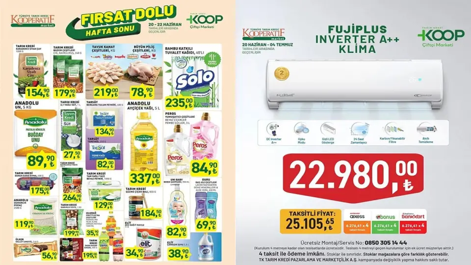 Tarım Kredi KOOP Çiftçi Marketi, 20-22 Haziran 2025 tarihleri arasında avantajlı fiyatlarla dikkat çeken bir kampanya dönemine girdi. Siyah çaydan süt ürünlerine, çamaşır deterjanından klimaya kadar birçok ürün, indirimli fiyatlarla raflarda yer alıyor.