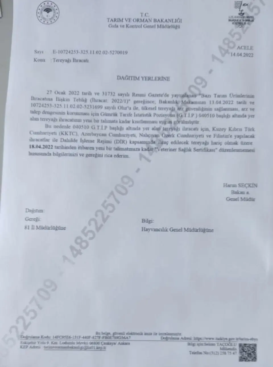 Tarım ve Orman Bakanlığı Gıda ve Kontrol Genel Müdürlüğü tarafından 81 il müdürlüğüne gönderilen yazı ile Kuzey Kıbrıs, Azerbaycan, Özerk Nahçıvan Cumhuriyeti, Dahilde İşleme Rejimi (DİR) dışında tereyağı ihracatına kısıtlama getirildiği bildirildi.