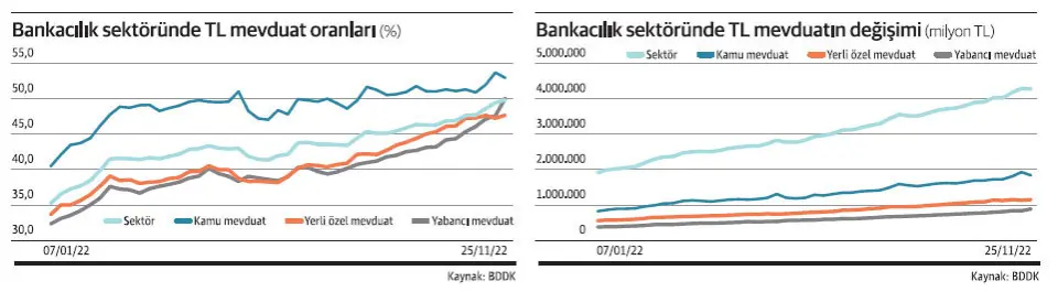 Merkez Bankası’nın liralaşma stratejisi kapsamında attığı adımlarla beraber bu yıl TL mevduat oranını en hızlı artıran bankacılık grubu yabancı mevduat bankaları oldu. 2022’nin ilk haftasında TL mevduat oranı sadece yüzde 32,33 olan yabancı mevduat bankaları 25 Kasım haftasına gelindiğinde TL mevduat oranlarını 17.71 puan artırmayı başardı. Kamu mevduat bankalarında da yaklaşık 11 ayda TL mevduat oranındaki artış 12.45 puan oldu yılın ilk haftasında kamu mevduat bankalarının da TL mevduat oranı yüzde 40,45 ile yüzde 50 sınırının altında bulunuyordu. Yerli özel mevduat bankalarında ise 11 ayda 14 puanlık artış yaşandı ve TL mevduatın oranı yüzde 33,64 seviyesinden yükseliş gösterdi. Sektörde ise 14.58 puanlık bir yükseliş oldu.