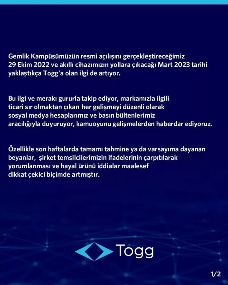 TOGG'un resmi sosyal medya hesaplarında yayınlanmamış haberler, hangi mecrada yer alırsa alsın gerçekliği şirketimiz tarafından teyit edilmemiş bilgilerdir.