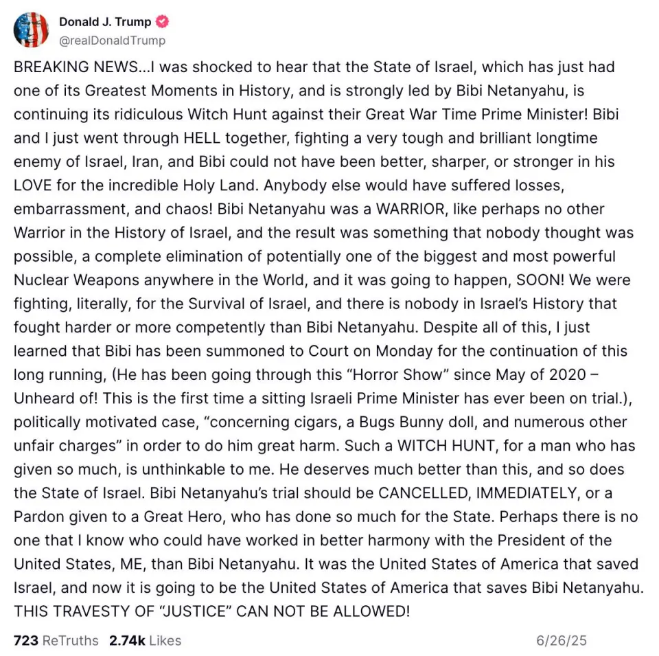 Trump, sosyal medya paylaşımında Netanyahu’yu hedef aldı: “ABD İsrail’i kurtardı, şimdi de Bibi’yi kurtaracak.” Tepki çeken sözler gündeme oturdu.