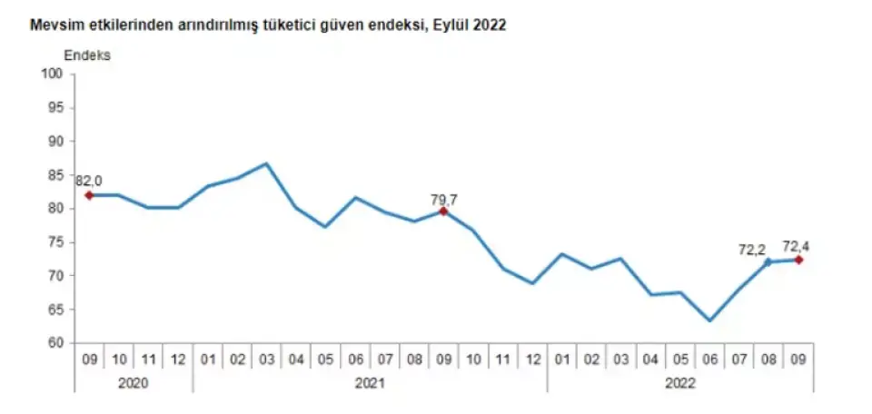 Tüketici güven endeksi eylülde 0,3 arttı. Türkiye İstatistik Kurumu'nun açıkladığı verilere göre tüketici güven endeksi 72,4 oldu.