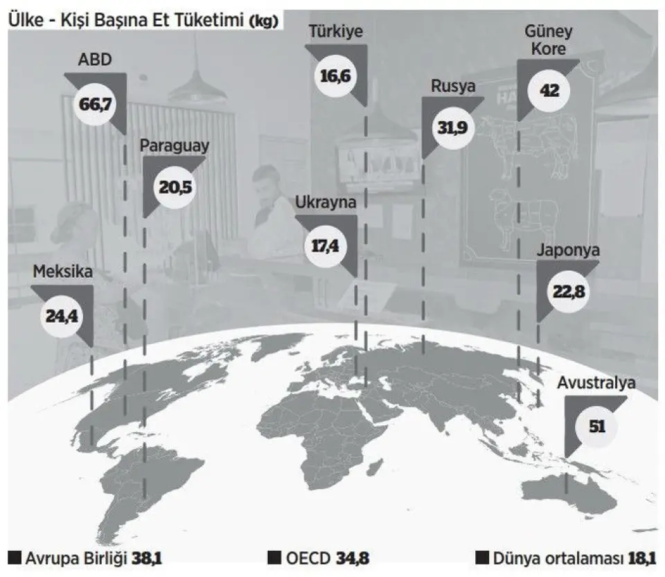 Dünya genelinde artan gıda tüketimiyle birlikte et tüketimi de dikkat çekici seviyelere ulaşmış durumda. Ancak Türkiye'de kişi başına düşen yıllık et tüketimi, 16,6 kilogram ile dünya ortalamasının (18,1 kg) bile altında kalıyor. OECD ortalaması 34,8 kg iken, Avrupa Birliği'nde bu rakam 38,1 kg. Türkiye'nin bu düşük performansının arkasında ise et fiyatlarındaki artış ve alım gücündeki gerileme yatıyor.