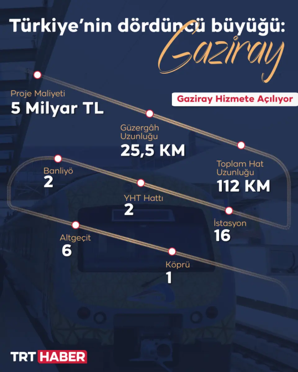 Gaziray Projesi kapsamında 2 adet banliyö hattı ve 2 adet hızlı tren hattı olmak üzere 25,5 km’lik güzergâh dâhilinde toplamda 112 km yeni demiryolu inşa edildi. Oteller ve hastaneler bölgesine bu yolla metro tipi toplu taşıma hizmeti de sunuluyor. 5 km’lik yer altı çalışması ile yerüstü planlamasında yeşil alanlara dokunulmadan çalışma imkânı oluşturuldu, şehrin yeşil dokusu korundu.